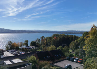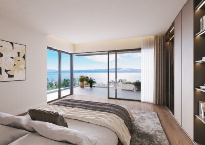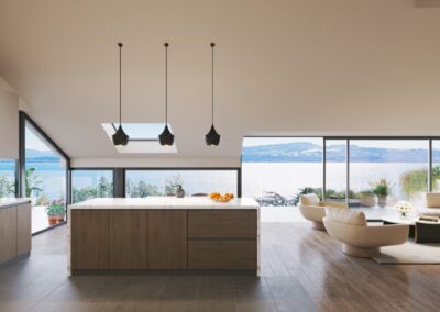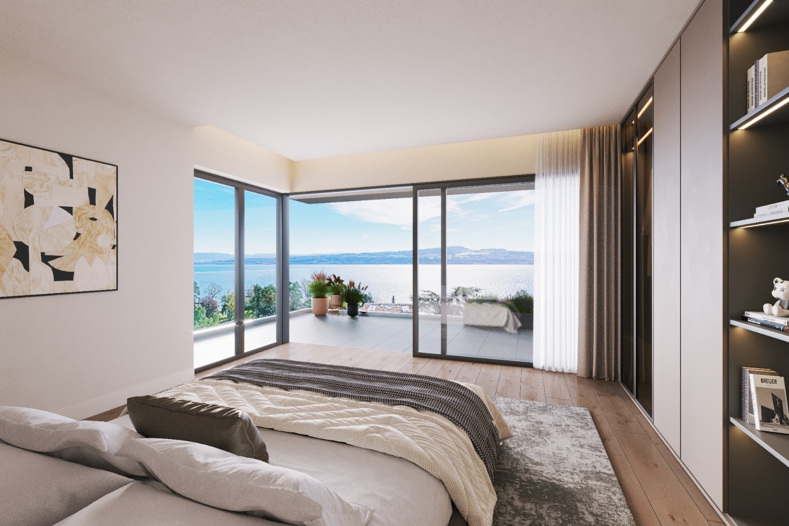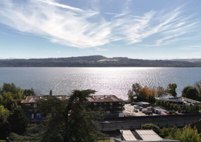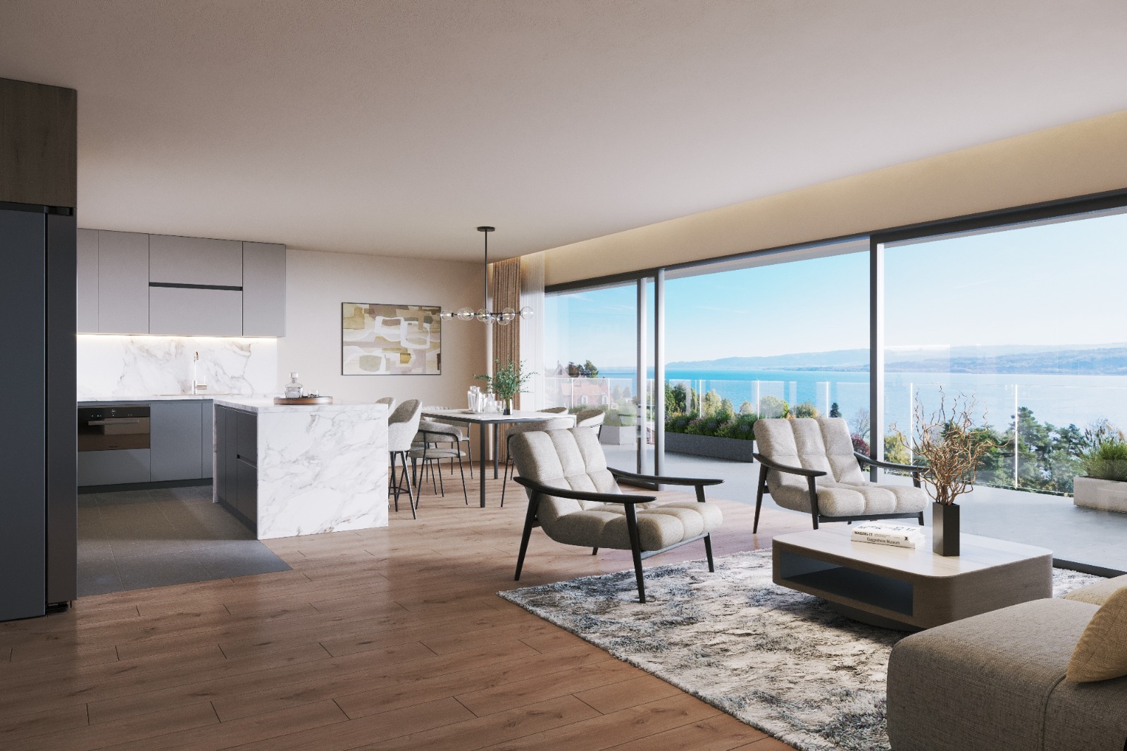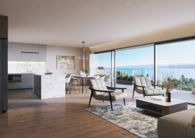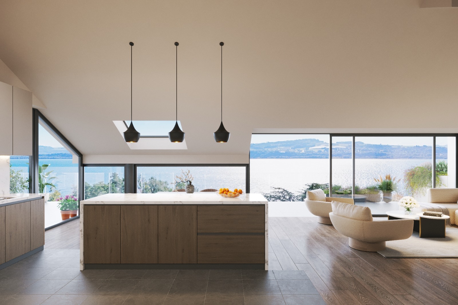 Montez au dernier étage. Ici, le temps s’arrête. Derrière la porte, un hall raffiné vous accueille et déjà la lumière vous attire vers l’horizon. Puis soudain, le séjour-cuisine de 50 m² s’ouvre devant vous, tel un amphithéâtre tourné vers le lac. Les baies vitrées du sol au plafond effacent la frontière entre intérieur et extérieur. Le lac devient votre décor quotidien, vos couchers de soleil, une œuvre d’art vivante.